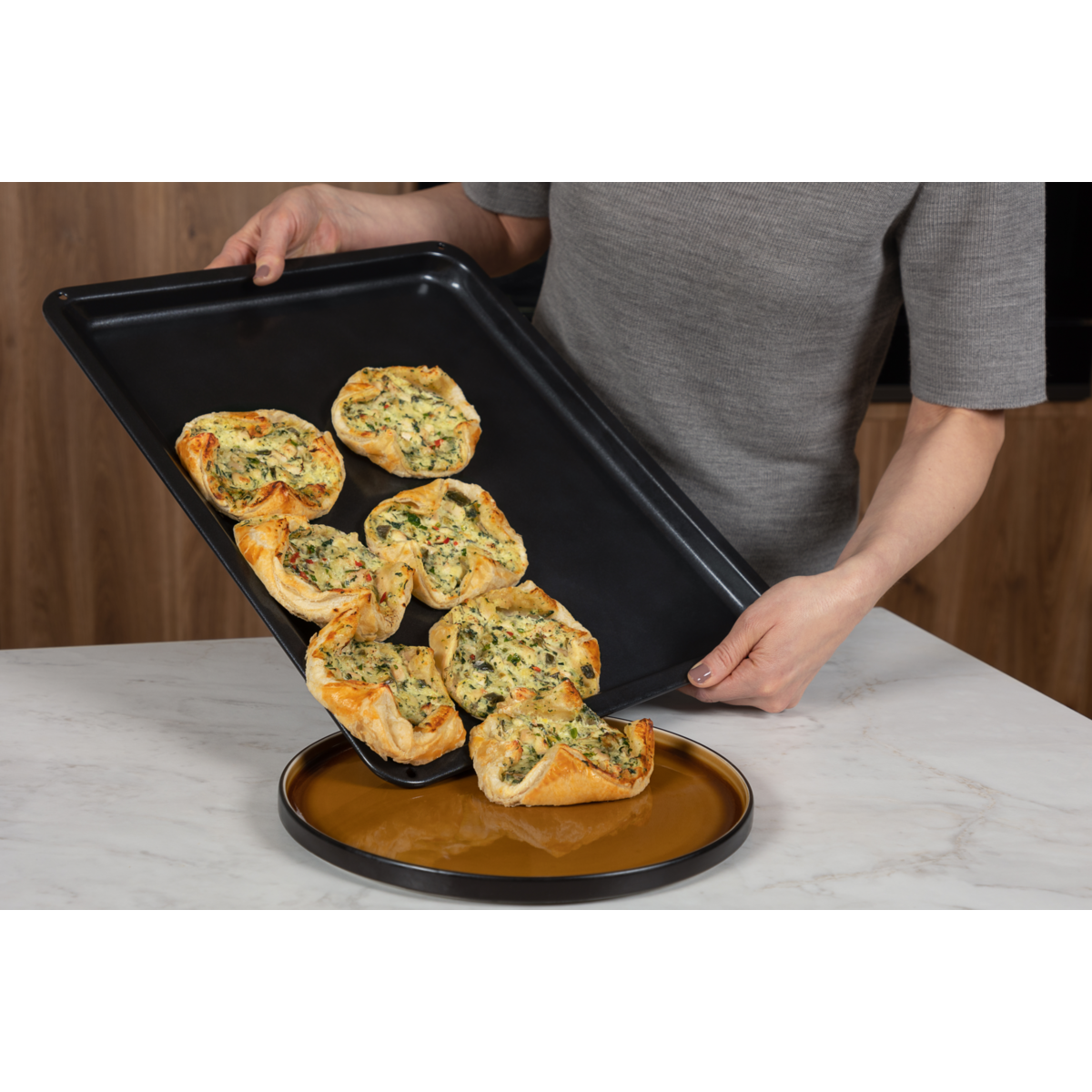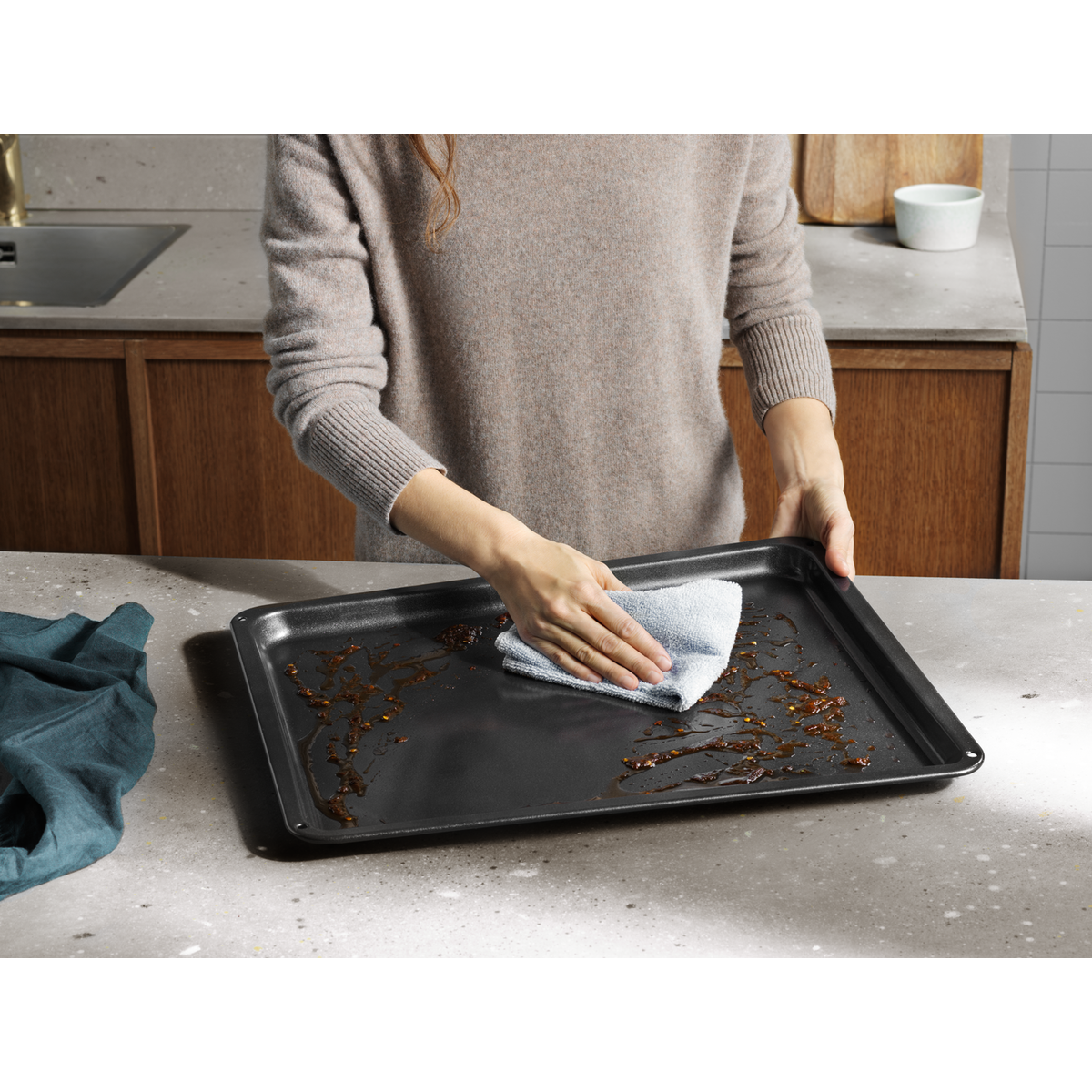Pekač Easy2Clean ima prevleko proti prijemanju, ki omogoča pripravo jedi brez papirja za peko. In ker obenem preprečuje oprijemanje maščobe in umazanije, ga lahko preprosto očistite z vodo, mokro krpo in malce detergenta za pomivanje posode.