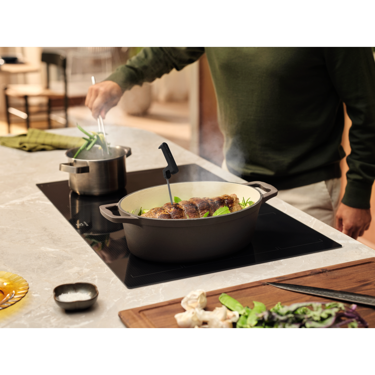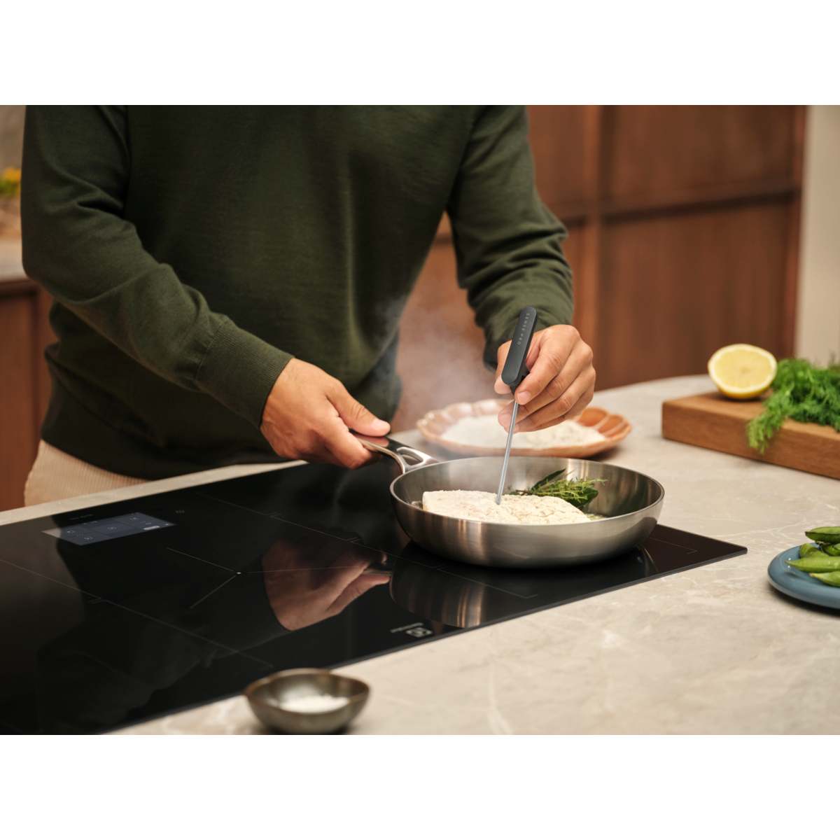 900 SensePro indukcijska kuhalna plošča ima brezžično temperaturno sondo, ki meri temperaturo hrane in samodejno prilagodi nastavitve kuhalne plošče za natančno segrevanje. Izboljšajte okus in teksturo ne glede na to, kaj pripravljate.