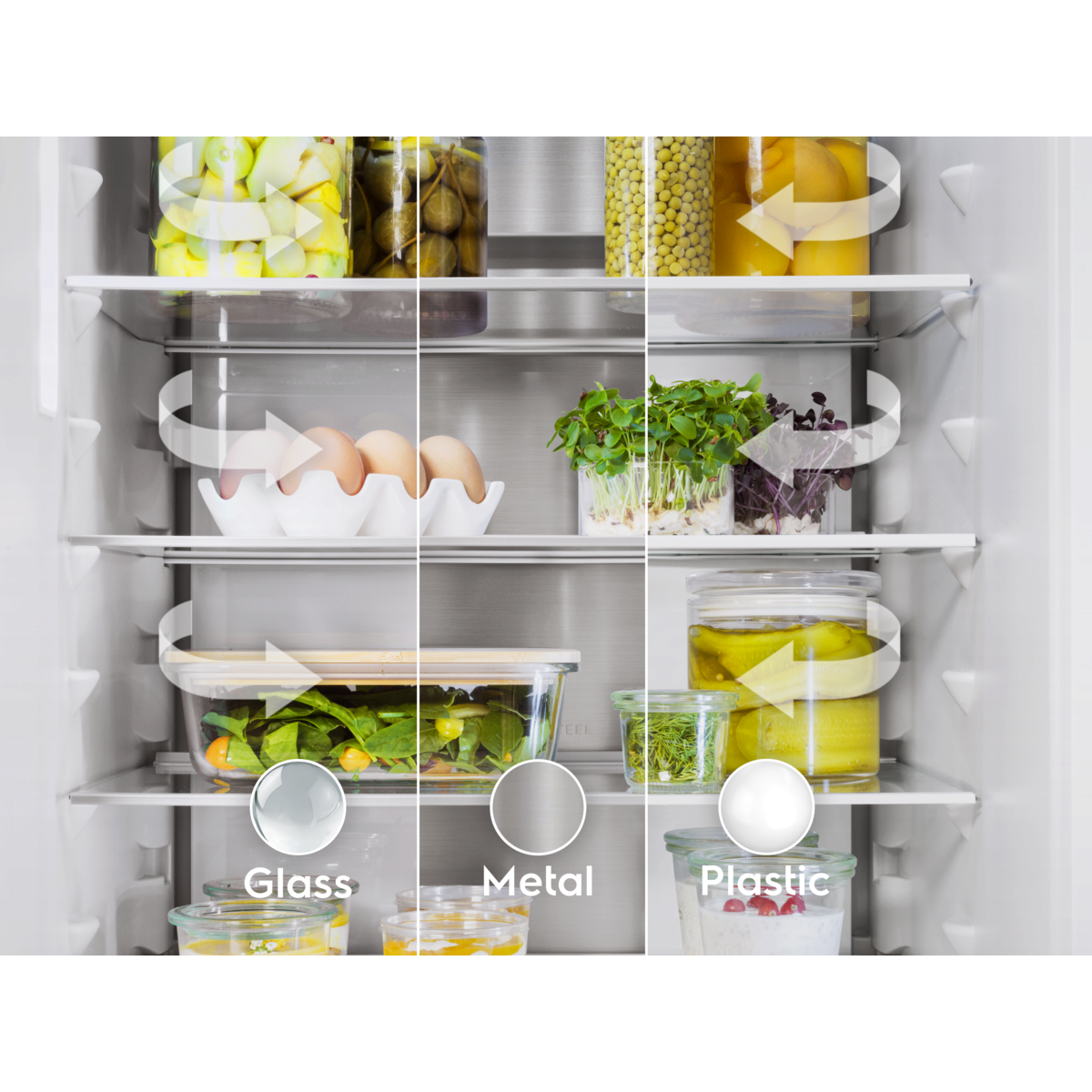 Hladilnik z zamrzovalnikom 700 No Frost AI CoolAssist se prilagodi vaši dnevni rutini, ne glede na to, ali dodajate sveža živila ali odhajate na počitnice. No Frost preprečuje nabiranje ledu, zato vam ga ni treba odmrzovati.