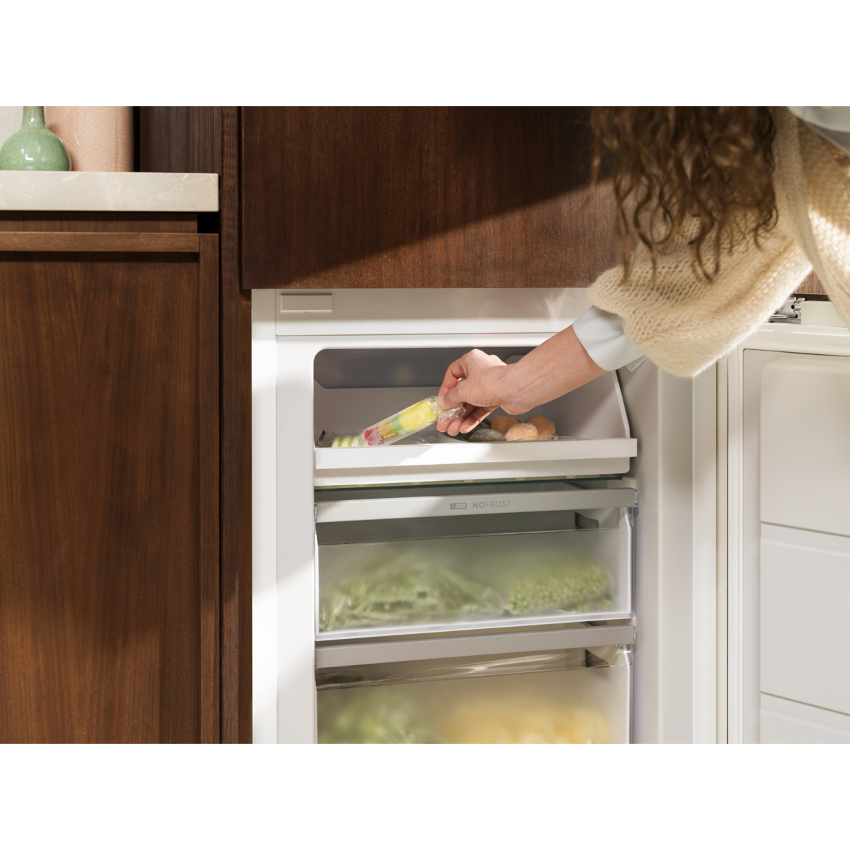 Hladilnik z zamrzovalnikom 700 No Frost AI CoolAssist se prilagodi vaši dnevni rutini, ne glede na to, ali dodajate sveža živila ali odhajate na počitnice. No Frost preprečuje nabiranje ledu, zato vam ga ni treba odmrzovati.