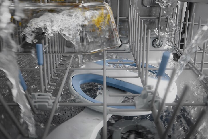 **Na podlagi neodvisnega testa nemškega inštituta tretje strani, z uporabo detergentnih tablet in 90-minutnega cikla na posodi z ostanki lazanje.