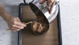 Stepamo tri jajca skupaj s sladkorjem v posodi za mešanje, dokler se sladkor ne raztopi. Mešanico nato vlijemo v mešalnik in mešamo, dokler se volumen mešanice ne poveča za trikrat. Za našega kuhinjskega robota Kitchen Assistant je tovrstno mešanje enostavno opravilo. Nato presejemo krompirjev škrob z moko, kakavom v prahu in pecilnim praškom. Potem vsujemo suhe sestavine v jajčno mešanico. Testo vlijemo v okrogel pekač za torto s premerom 16 cm.