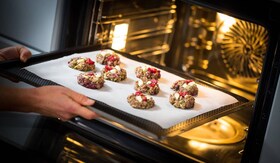 Z rokami oblikujemo 8 majhnih kroglic. Sploščimo jih na papirju za peko in oblikujemo piškote. Pečemo 10–15 min pri 200 °C.