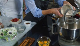 Jajca razbijemo v posodo kuhinjskega robota Electrolux Kitchen Assistent in jih zmešamo. Nato dodamo vse suhe sestavine in ponovno zmešamo. Dodamo stopljeno čokolado in sirup iz jeruzalemskih artičok ter mešamo, da zmes postane gladka.