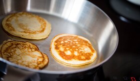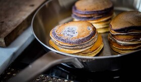 V naoljeni ponvi popečemo dve palačinki do zlato-rjave barve. V mešanico dodamo 1 jedilno žlico borovničevega soka in dobro premešamo. Z novo mešanico spečemo še dve palačinki. Po 1 žlico borovničevega soka dodajamo, dokler nam ne zmanjka mase za palačinke.