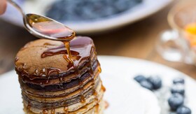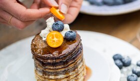 Pred serviranjem uporabimo nož, da olepšamo palačinke in poudarimo barve. Po vrhu polijemo karamelo in pojemo palačinke, dokler so še tople.