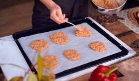 Vse sestavine zmešamo skupaj. Na papirju za peko oblikujemo šest pleskavic in pustimo, da se na zraku sušijo 30 minut. Pečemo 20 minut pri 230 °C.