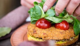 Pleskavica: 265 g kuhane leče / 180 g nastrganega korenja / ¼ rdeče paprike / 6 posušenih paradižnikov / ½ limoninega soka / poper po okusu / 4 žlice kisa / 4 žlice olvinega olja / pest peteršlja / 1 jajce