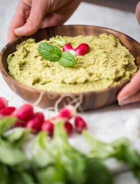 Stisnemo česen. Sestavine damo v mešalnik v enakem zaporedju, kot so naštete zgoraj. Mešamo, dokler ne dosežemo želene gostote. Serviramo na krožniku in pojemo skupaj z redkvicami.