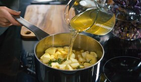 Pastinjak prestavimo v kozico, ga prekrijemo z juho in kuhamo še 10 minut