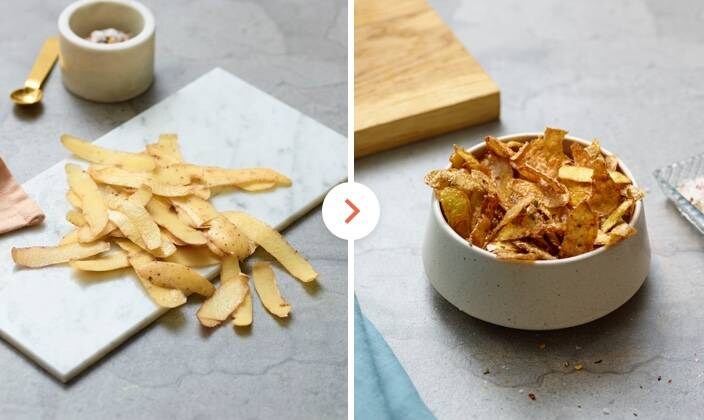 1Čips iz krompirjevih lupinKrompirjevo lupino pri pripravi krompirja pogosto zavržemo. Namesto tega jo raje specite v pečici z malce olivnega olja in ščepcem soli. Gostom pred večerjo postrezite z okusnim hrustljavim prigrizkom.