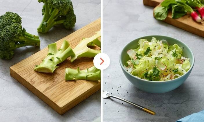 3Solata iz stebla brokolijaShranite stebla! Nič manj vredna polovica brokolija so stebla, ki so prav tako hranljiva kot cvetki. Stebla na tanko narežite z ostrim nožem za zelenjavo, nato pa zmešajte z najljubšimi sestavinami za solato.