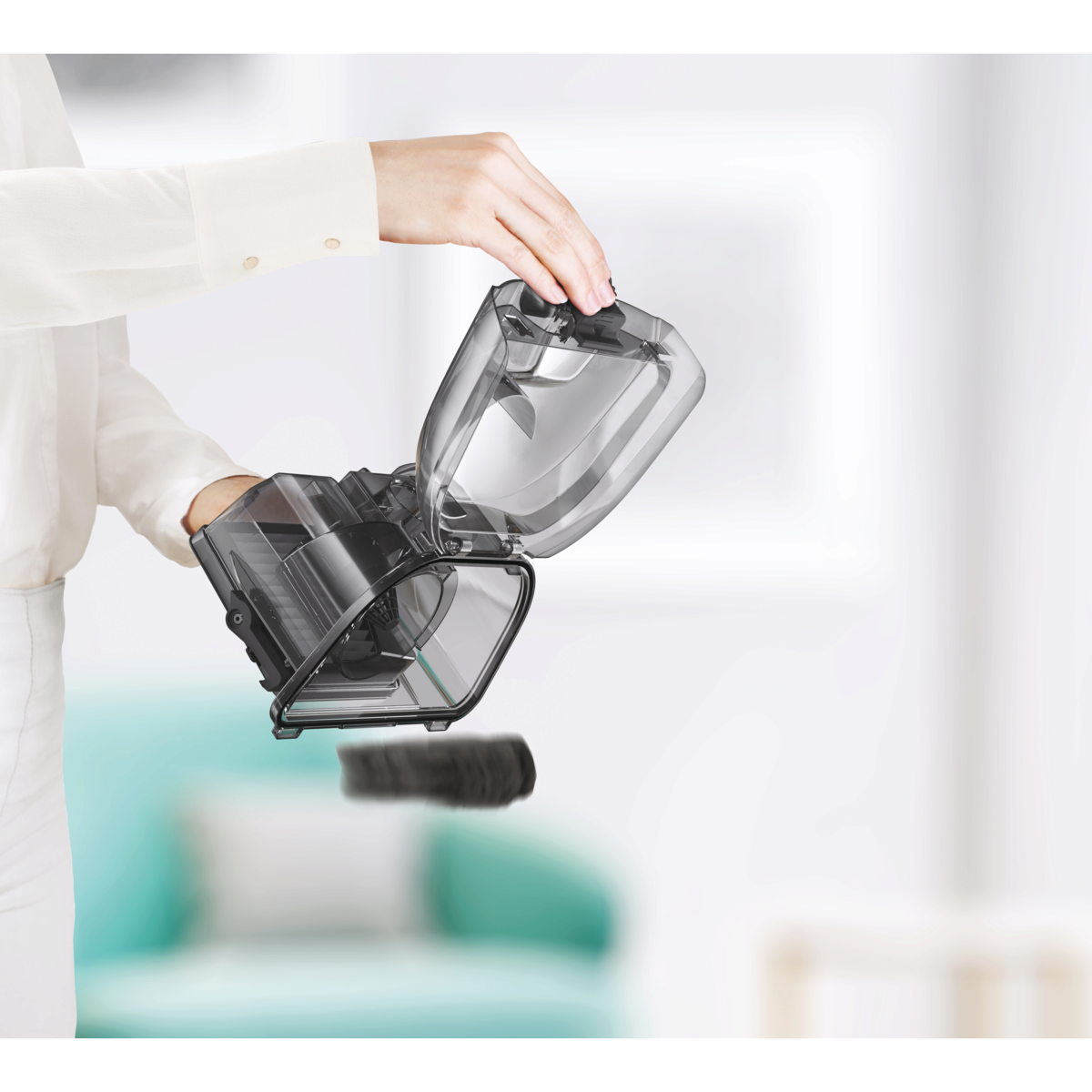Nič več prahu s posodo brez vrečke – za preprosto sesanje in praznjenje posode.